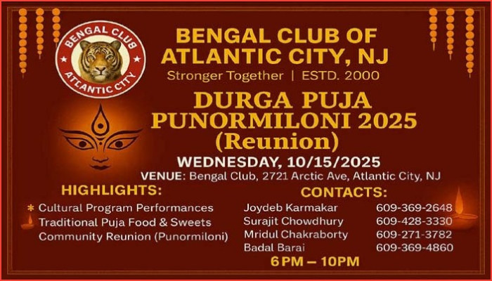 আটলান্টিক সিটি, ৯ অক্টোবর : নিউ জার্সি রাজ্যের আটলান্টিক সিটিতে বেংগল ক্লাবের উদ্যোগে আগামী ১৫ অক্টোবর, বুধবার শারদীয় দুর্গাপূজা পরবর্তী পূজা পুনর্মিলনীর আয়োজন করা হয়েছে।