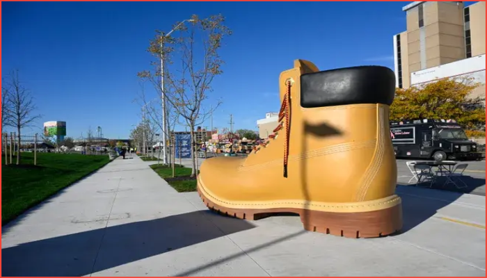 ডেট্রয়েটের রাল্ফ সি. উইলসন, জুনিয়র সেন্টেনিয়াল পার্কে প্রবেশের মুখে অতিথিদের স্বাগত জানায় এক বিশাল বুটের ভাস্কর্য/Jose Juarez, Special To Detroit News