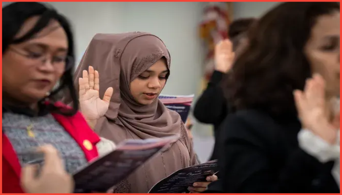 বাংলাদেশি সুমাইয়া তাসনিম ২০২৪ সালের ৮ অক্টোবর ডিয়ারবর্নের ফেয়ারলেন ভোজসভায় ন্যাচারালাইজেশন অনুষ্ঠানে আনুগত্যের শপথ পাঠ করছেন/Photo : Andy Morrison, The Detroit News